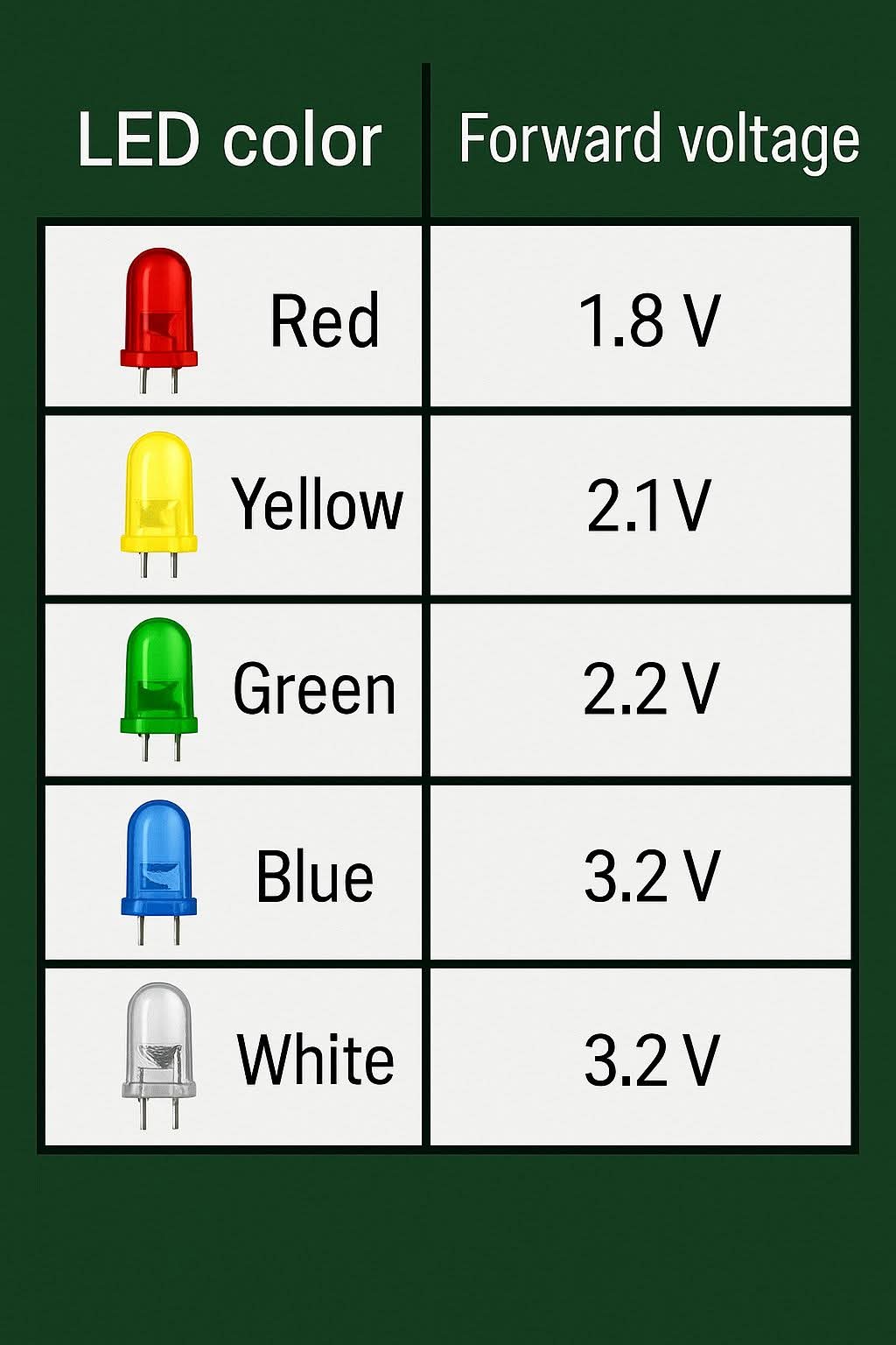 Bảng tham khảo điện áp hoạt động của một số LED