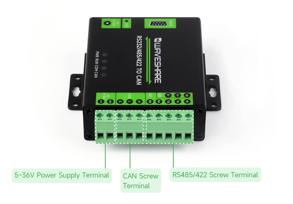 - Supports data communication and conversion between RS232/485/422 and CAN interfaces.