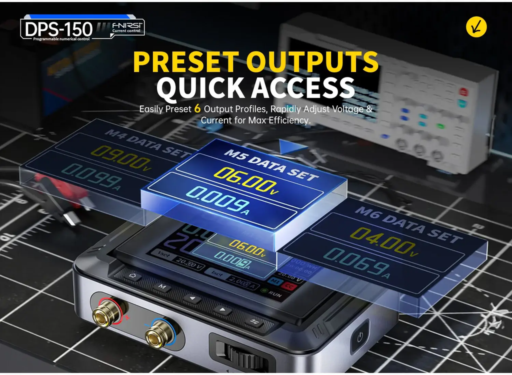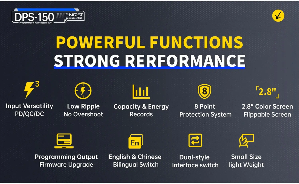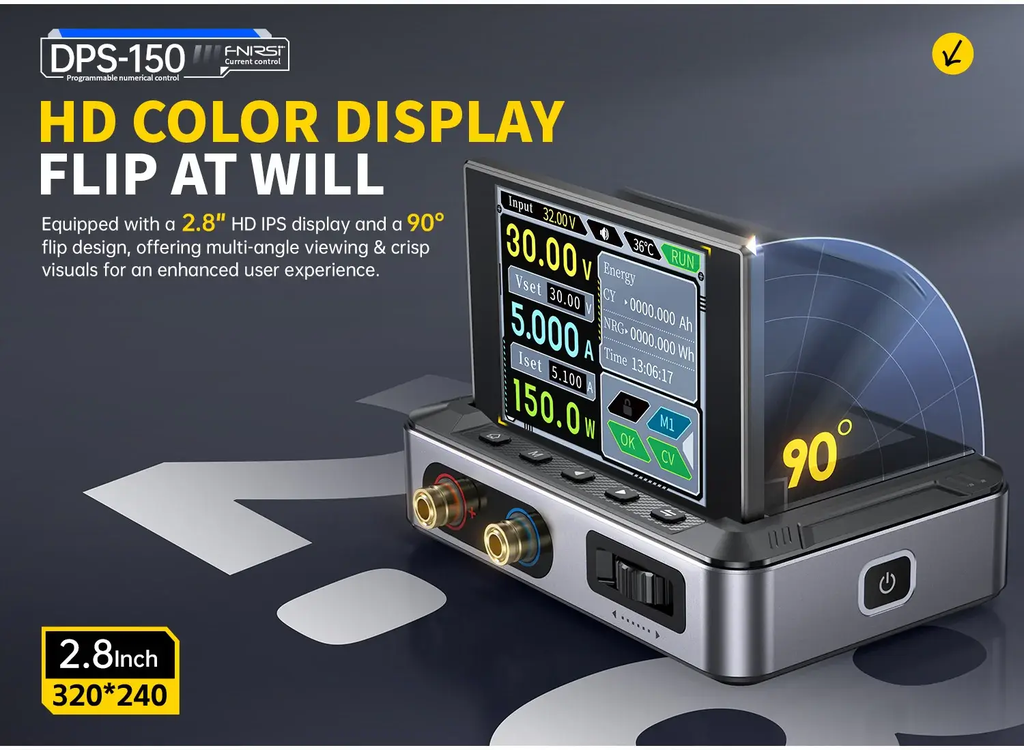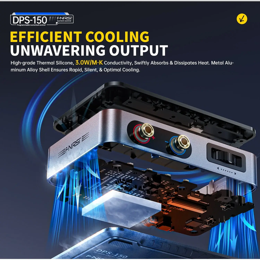 Bộ nguồn FNIRSI® DPS-150 Mini DC Adjustable Power Supply tích hợp đầy đủ chức năng bảo vệ an toàn (quá áp, quá dòng, quá tải, quá nhiệt, chống đấu ngược), hiển thị rõ ràng, thao tác dễ dàng. Với thiết kế nhỏ gọn, tiện dụng, DP150 đáp ứng linh hoạt nhu cầu thí nghiệm, sửa chữa và các ứng dụng DIY.