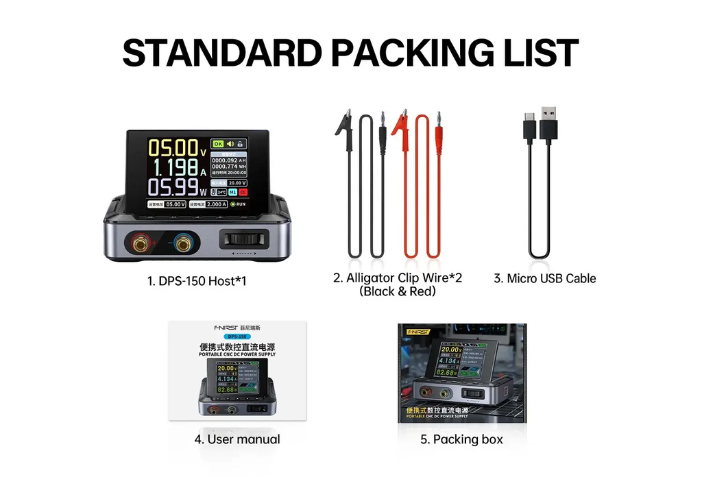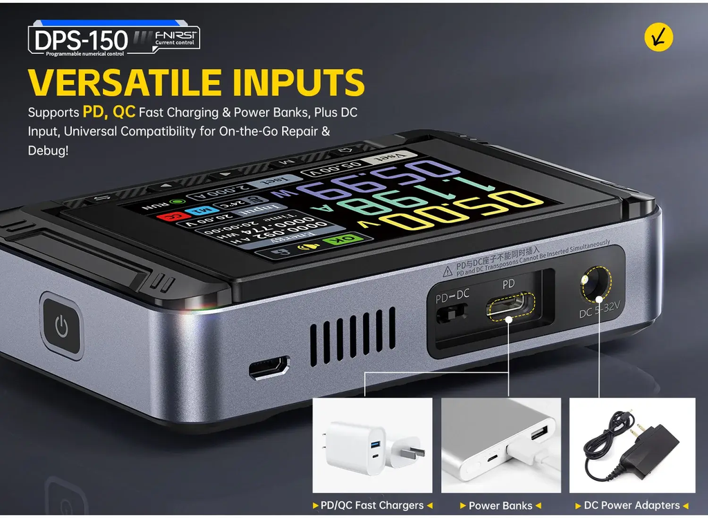 Bộ nguồn FNIRSI® DPS-150 Mini DC Adjustable Power Supply là bộ nguồn DC điều chỉnh hiệu suất cao, hỗ trợ đầu vào Type-C và nhiều chế độ cấp nguồn. Thiết bị cho phép điều chỉnh chính xác điện áp DC 0–30V và dòng điện 0–5A, với đầu ra ổn định, tiêu thụ điện năng thấp.
