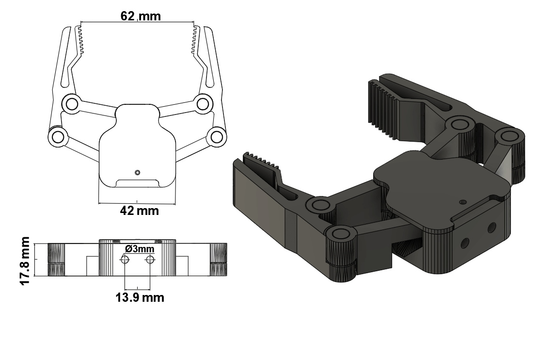 Bộ phận tay gắp được làm từ nhựa PETG với trọng lượng nhẹ và độ bền cao, bổ sung cơ chế chống kẹt, tăng độ ma sát với bề mặt tiếp xúc lớn kèm động cơ RC Servo 9G lắp ráp sẵn. Bộ phận nâng hạ được làm từ các khớp nối nhôm chắc chắn với trọng lượng nhẹ, khớp xoay bạc đạn cứng cáp kèm theo động cơ RC Servo MG996 với lực nâng lớn.