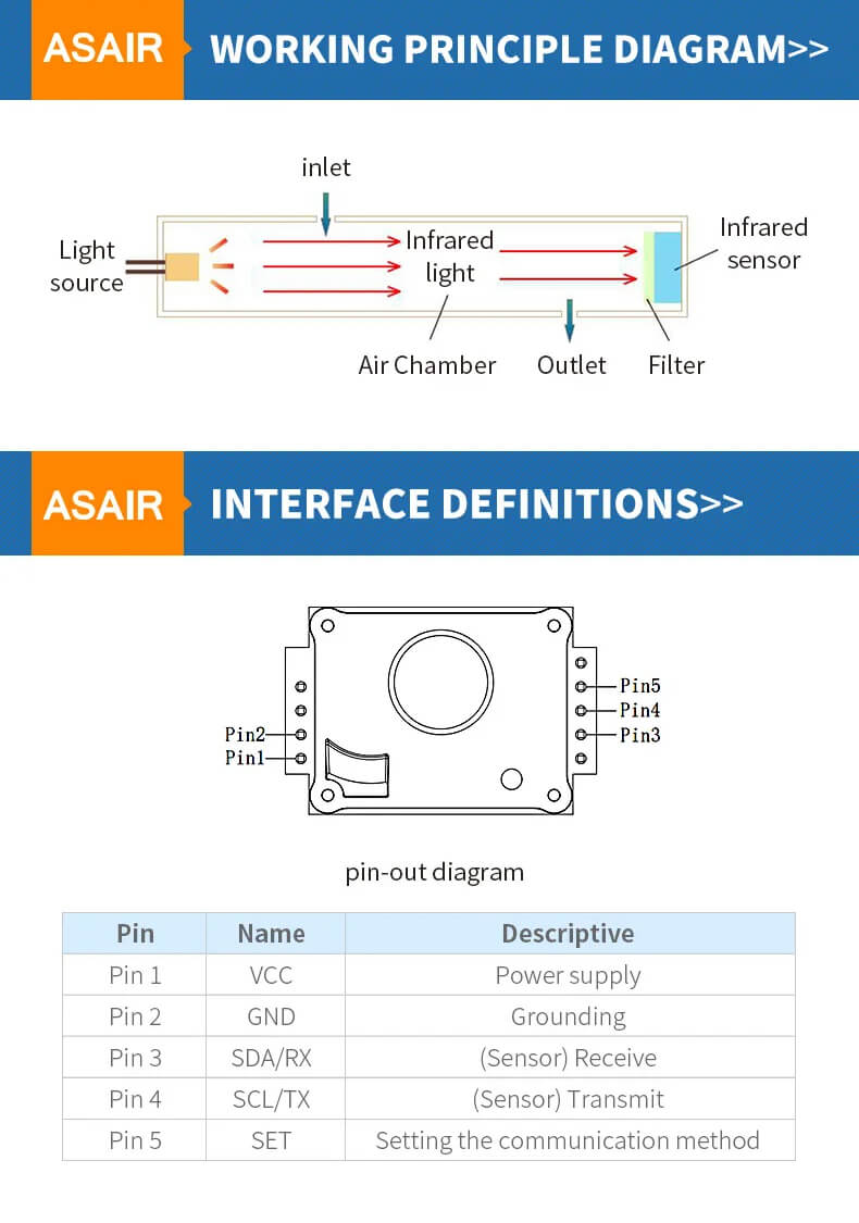 Cảm biến khí CO2 ACD1200 NDIR Carbon Dioxide Sensor chính hãng ASAIR là cảm biến đo khí CO2 sử dụng công nghệ hồng ngoại không phân tán (NDIR), mang lại độ chính xác cao, độ chọn lọc tốt và hoạt động ổn định lâu dài. Nhờ không phụ thuộc vào oxy và tích hợp đường quang học chính xác cùng mạch xử lý tín hiệu độ chính xác cao, ACD1200 có thể cung cấp dữ liệu CO2 đáng tin cậy trong nhiều điều kiện môi trường. Cảm biến hỗ trợ giao diện đầu ra kỹ thuật số tiêu chuẩn, phản hồi nhanh, thời gian phục hồi ngắn và khả năng chống nhiễu mạnh.