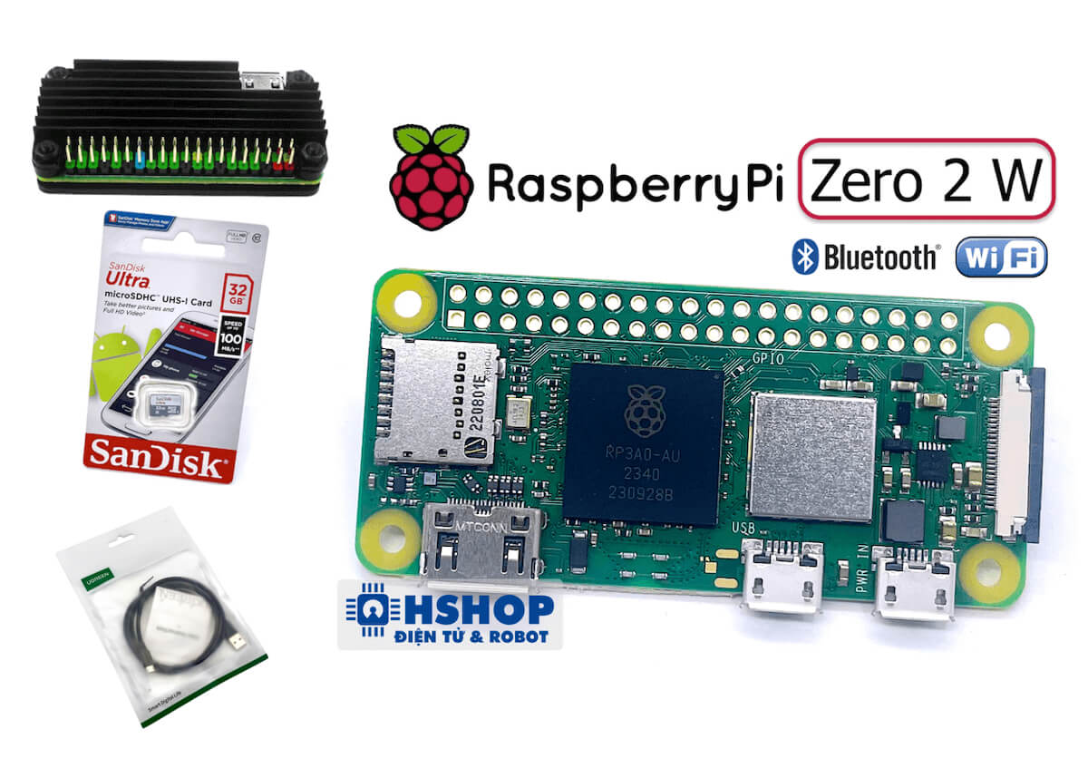 Combo Raspberry Pi Zero 2 W Basic Kit bao gồm Máy tính Raspberry Pi Zero 2 W kèm các phụ kiện cơ bản để máy có thể hoạt động bao gồm: