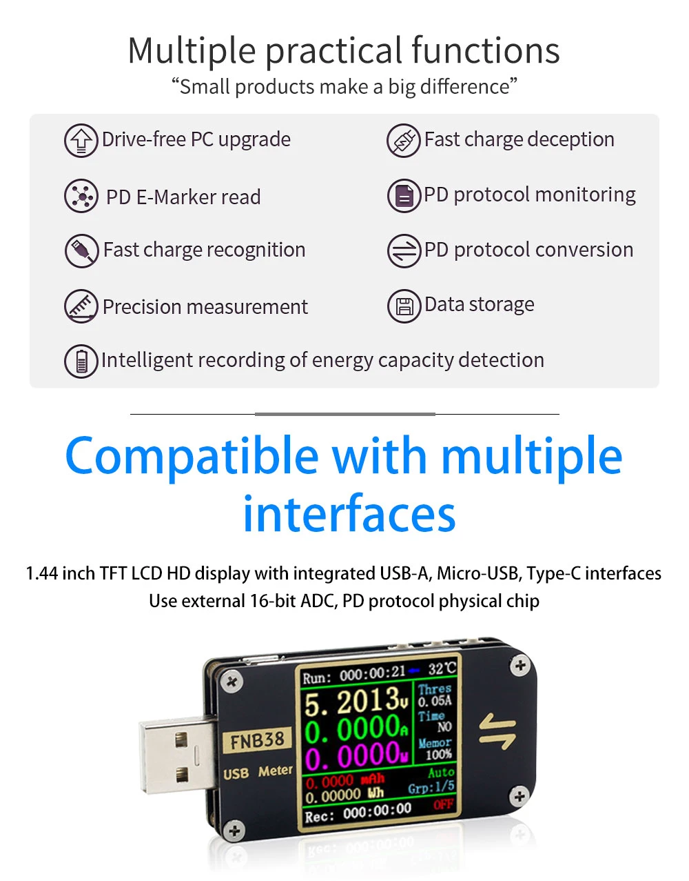 Đo dòng áp, công suất cổng USB đa năng FNIRSI® FNB38 USB Tester được tích hợp màn hình LCD TFT 1.44inch giúp hiển thị các thông số trực quan, tích hợp các cổng đầu vào thông dụng USB-A, USB-C, MicroUSB và hai cổng đầu ra USB-A / USB-C giúp kết nối và kiểm tra điện áp của hầu hết các thiết bị sử dụng cổng USB phổ biến hiện nay.
