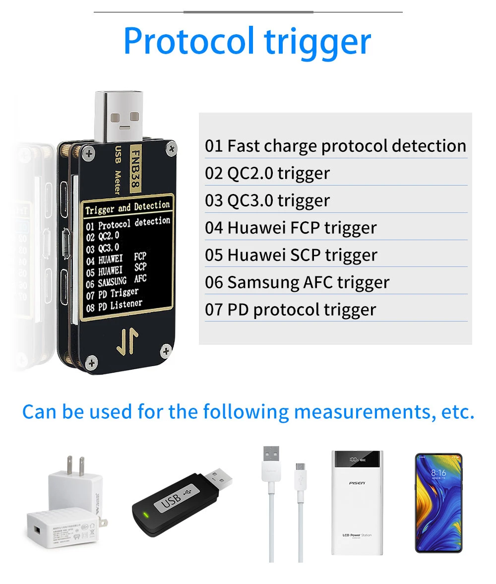 Đo dòng áp, công suất cổng USB đa năng FNIRSI® FNB38 USB Tester là một thiết bị chuyên dụng để đo các thông số của cổng USB như dòng điện, điện áp, công suất, dung lượng sạc, trở kháng cáp, rất hữu ích cho việc kiểm tra chất lượng và hiệu suất của cáp sạc, củ sạc, pin dự phòng, hoặc các thiết bị USB khác.
