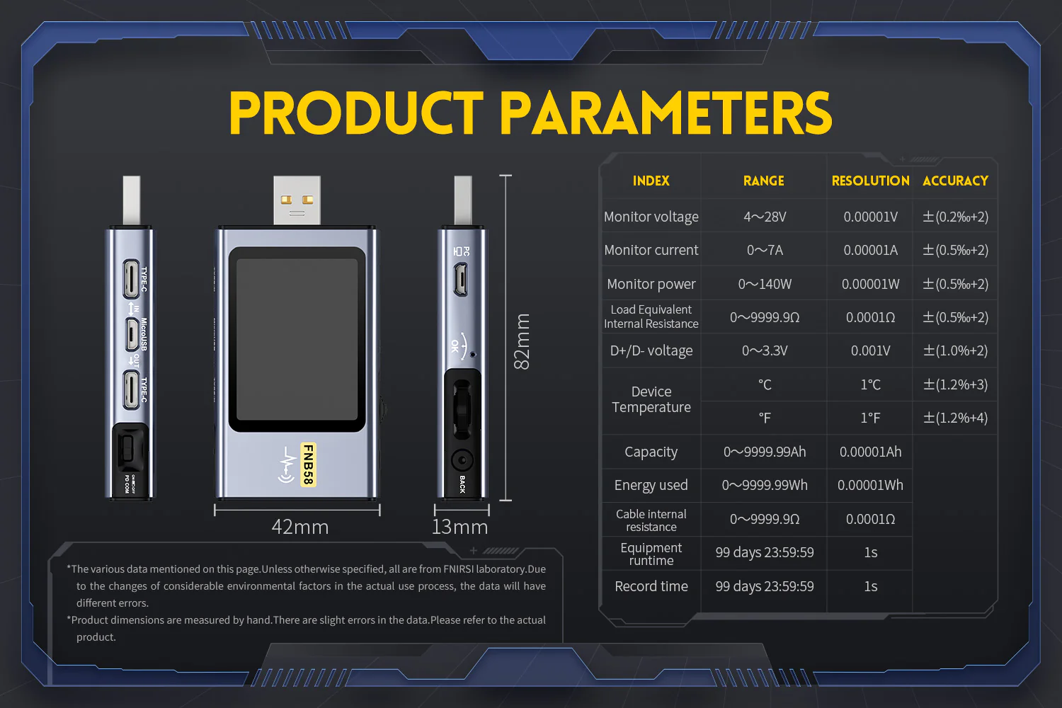 Đo dòng áp, công suất cổng USB đa năng FNIRSI® FNB58 BT USB Fast Charge Tester là một thiết bị chuyên dụng để đo các thông số của cổng USB như dòng điện, điện áp, công suất, dung lượng sạc, trở kháng cáp, rất hữu ích cho việc kiểm tra chất lượng và hiệu suất của cáp sạc, củ sạc, pin dự phòng, hoặc các thiết bị USB khác.