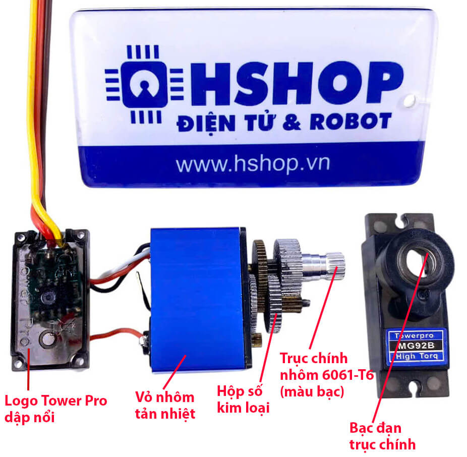 Động cơ Digital RC Servo MG92B 0-180° TowerPro Chính hãng (Genuine) có kích thước nhỏ gọn là phiên bản nâng cấp hoàn hảo của các dòng Mini RC Servo rất phổ phiến hiện nay như RC Servo 9G, MG90S,...với lực kéo khỏe lên đến 3.5Kg, động cơ có hộp số với bánh răng làm hoàn toàn bằng kim loại, trục chính động cơ được làm bằng nhôm hợp kim có độ cứng cao 6061-T6 (màu bạc) giúp giảm trọng lượng đồng thời được trang bị thêm bạc đạn giúp tăng độ bền và độ ổn định, thân động cơ được làm bằng nhôm giúp tản nhiệt cho động cơ khi sử dụng trong thời gian dài.