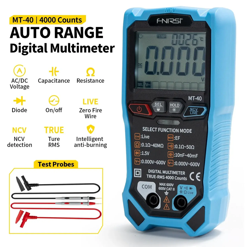 Đồng hồ vạn năng VOM tự động FNIRSI® MT-40 Smart Digital Multimeter sử dụng chip xử lý tiên tiến có tốc độ lấy mẫu siêu nhanh 3 lần/giây, cung cấp dữ liệu theo thời gian thực để phân tích chính xác. Thiết bị mạnh mẽ này hỗ trợ nhiều chức năng, bao gồm đo True RMS, điện dung, điện trở, kiểm tra diode và phát hiện điện áp không tiếp xúc.