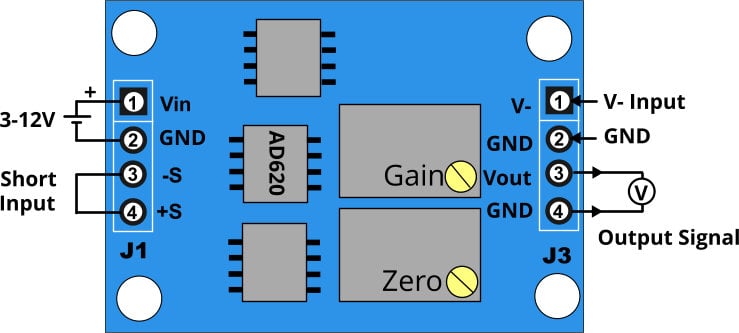 Zero output calibration is done by shorting the input terminals and adjusting the Zero potentiometer until the output is equal to zero