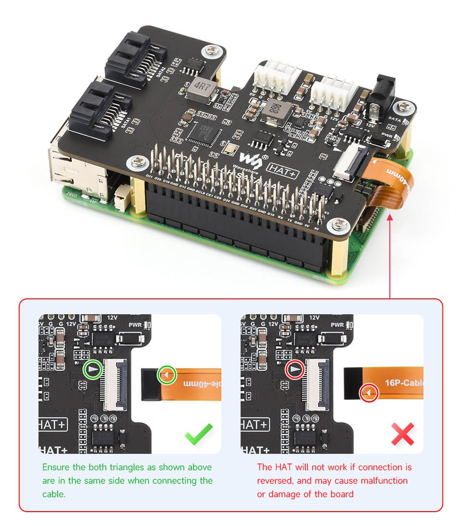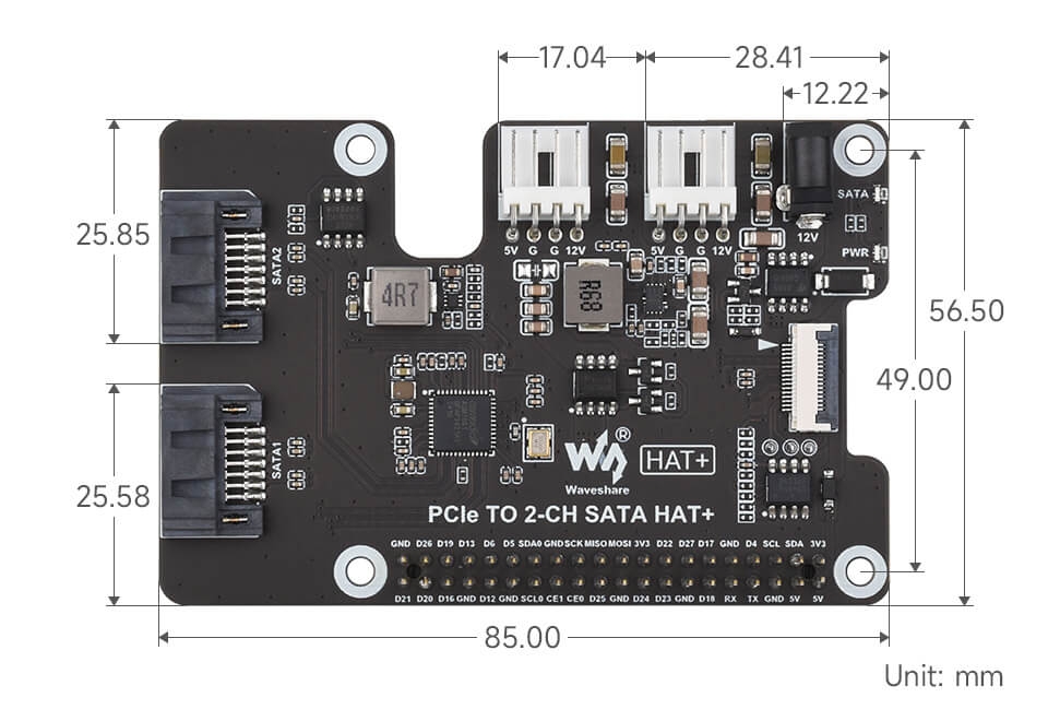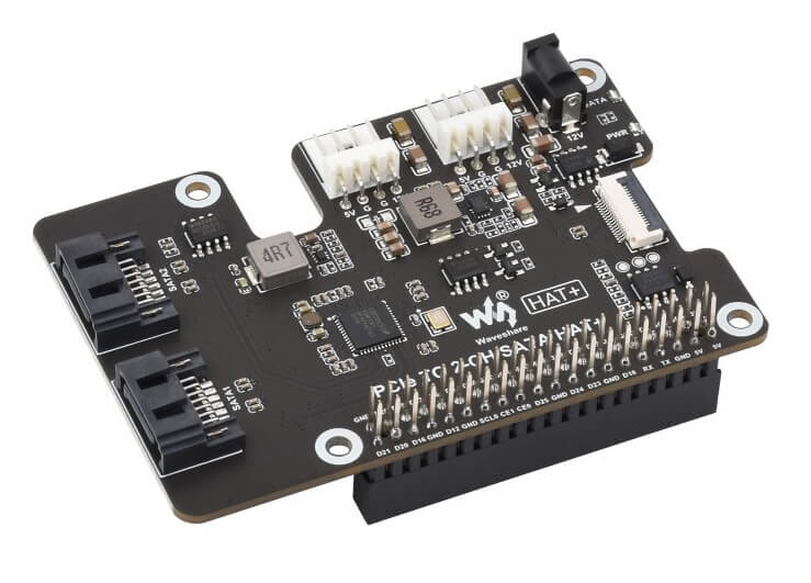 Mạch Waveshare PCIe To 2-Ch SATA HAT+ For Raspberry Pi 5 có chức năng chuyển đổi cổng PCIe của Raspberry Pi 5 sang 2 cổng SATA, cho phép kết nối trực tiếp 2 ổ cứng/SSD SATA để làm NAS, lưu trữ dữ liệu dung lượng lớn hoặc server mini.