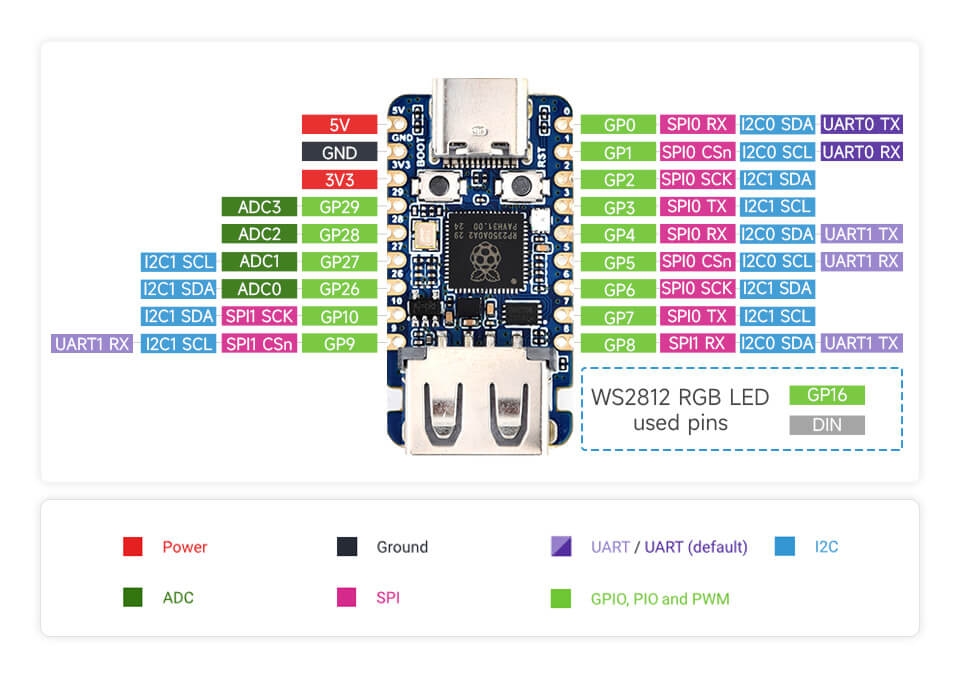 Mạch Waveshare RP2350 USB-A Mini Development Board còn có thêm cổng USB Type-A hỗ trợ USB Host or Device mở rộng qua PIO (Programmable I/O), tương thích USB 2.0/1.1 giúp kết nối với các thiết bị sủ dụng giao tiếp USB.