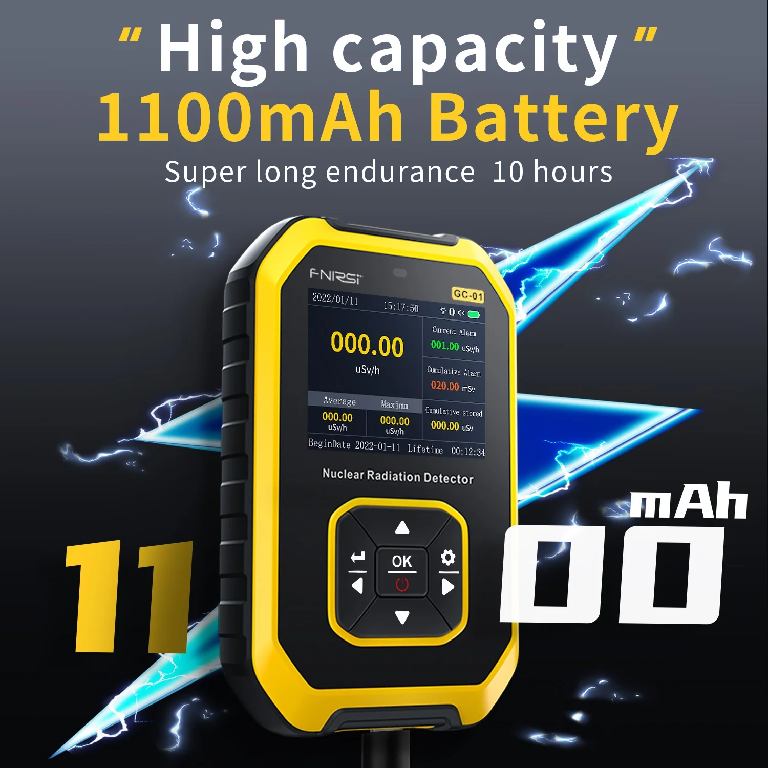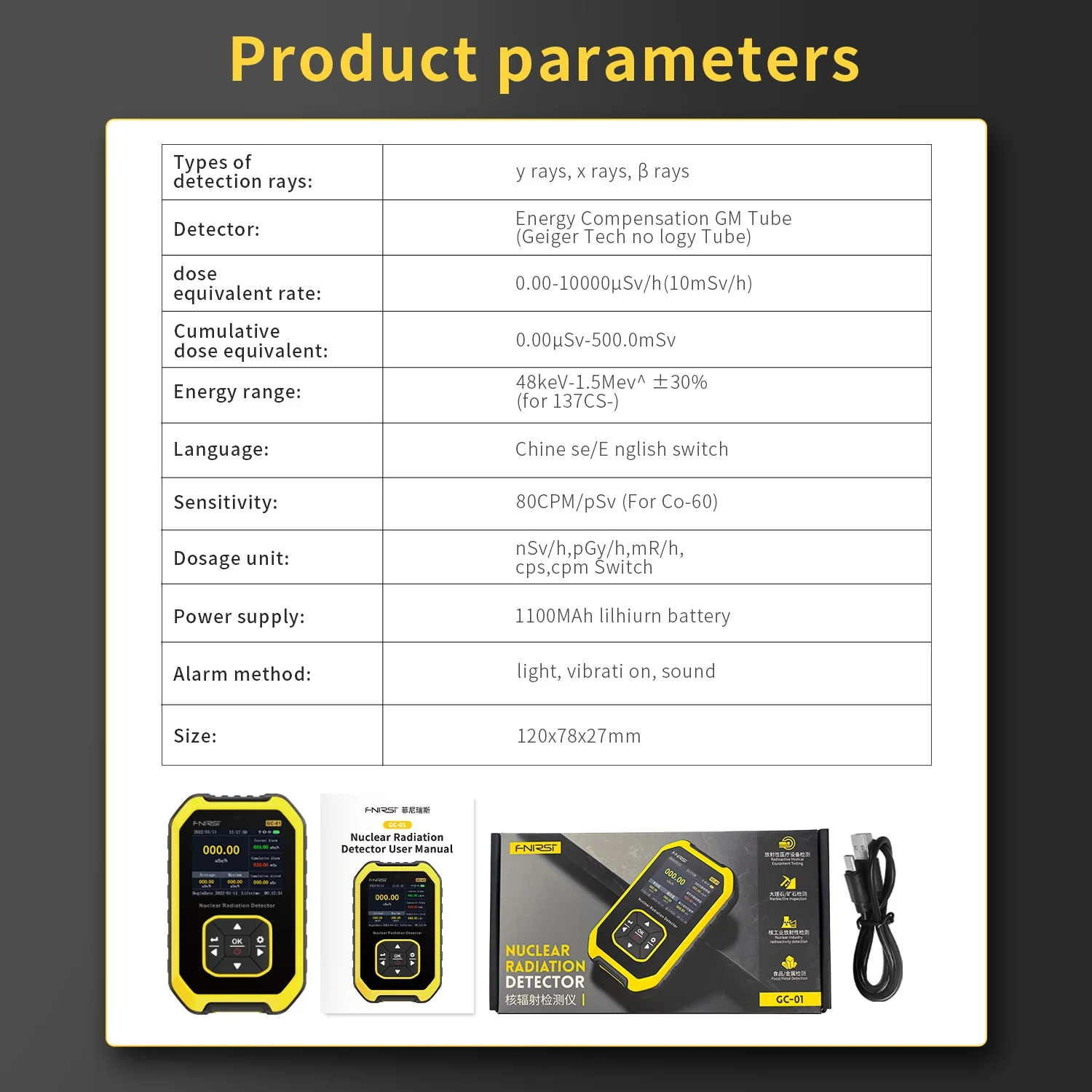 Máy đo bức xạ FNIRSI® GC-01 Nuclear Radiation Detector sử dụng bộ đếm Geiger-Miller có độ chính xác cao để phát hiện cường độ của bức xạ ion hóa, bao gồm các hạt beta, tia gamma và tia X.