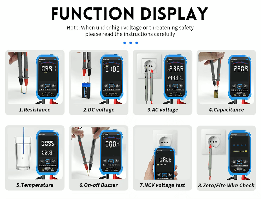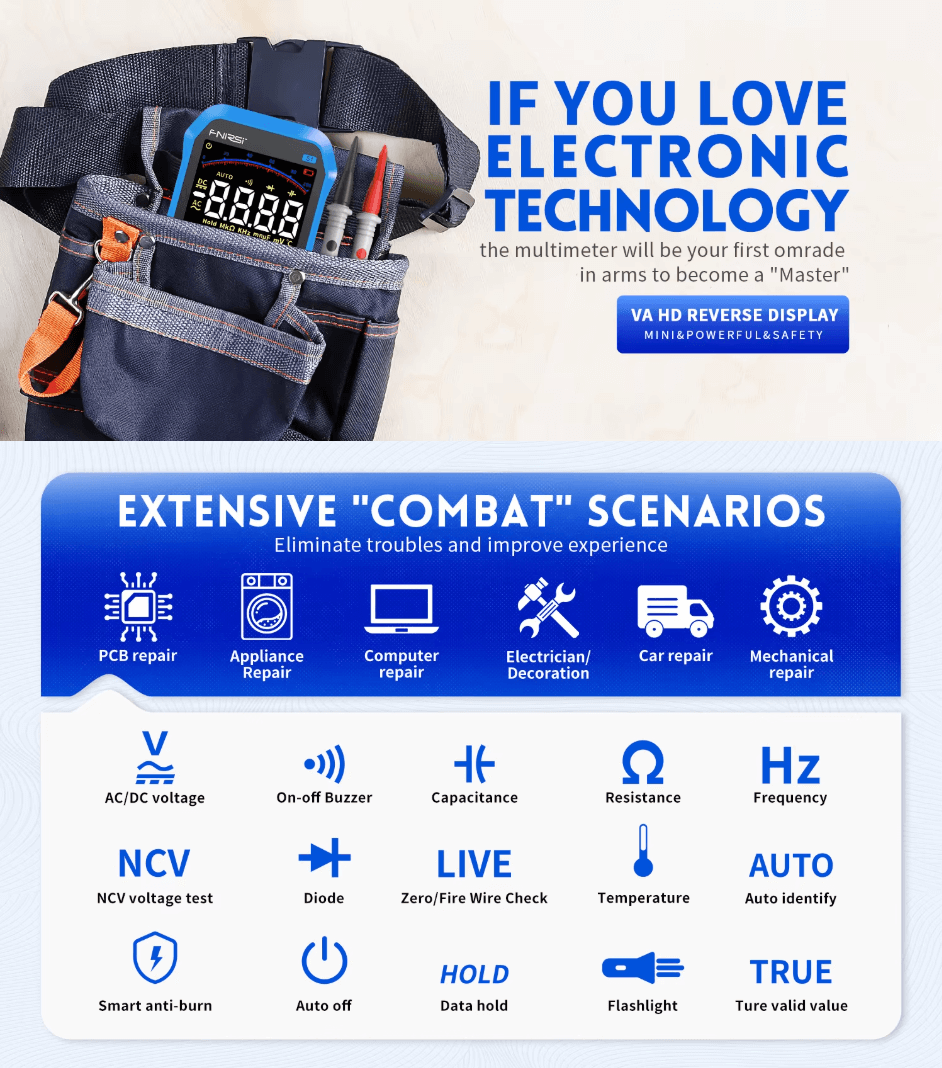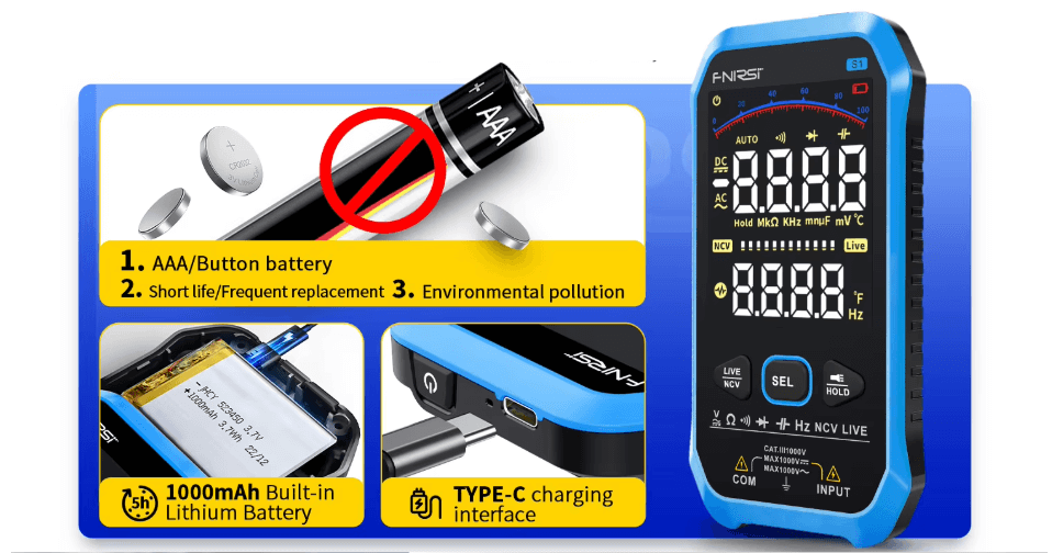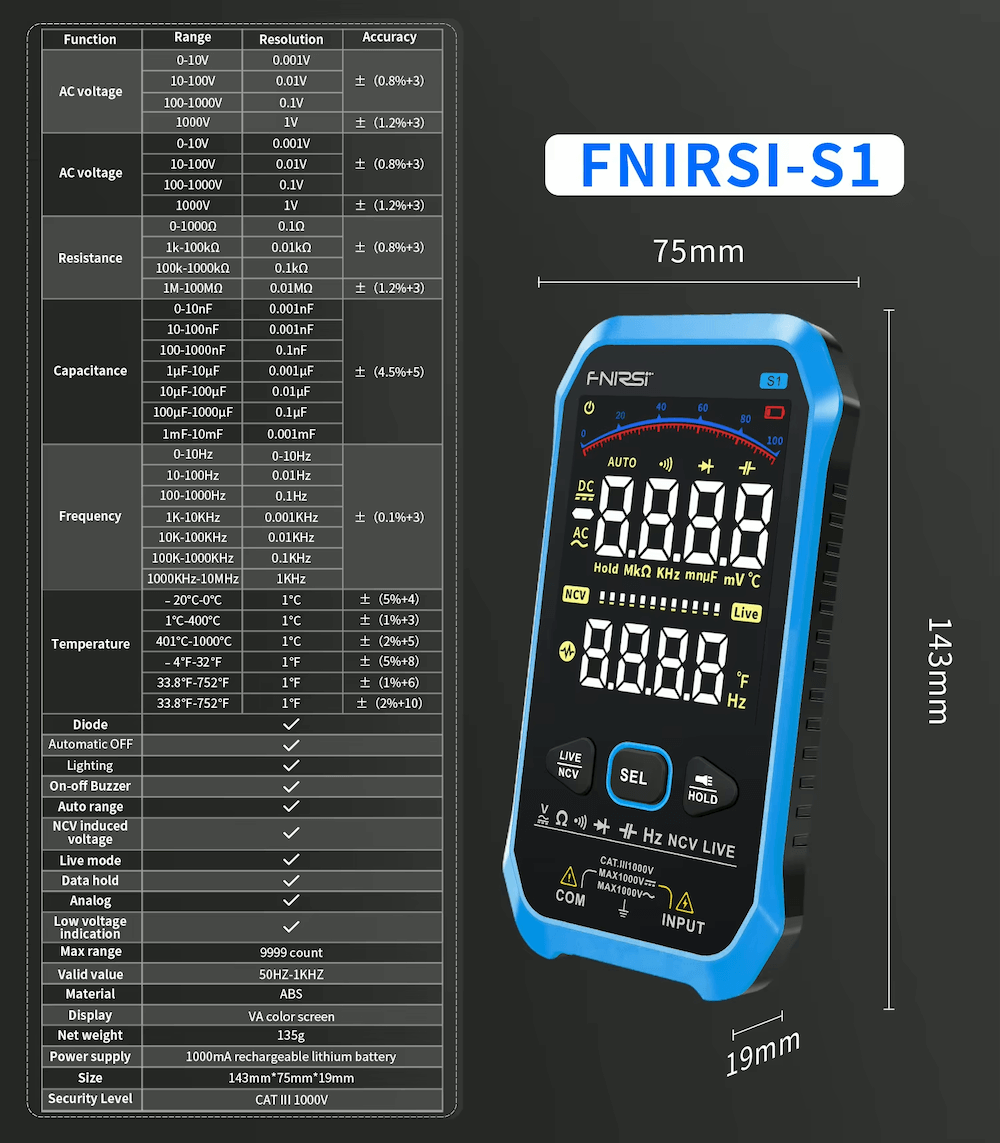 Máy đo đa năng FNIRSI® S1 Large Screen Digital Display Smart Multimeter là một thiết bị đo thông minh được tích hợp các công nghệ hiện đại như màn hình kỹ thuật số lớn, giao diện người dùng thân thiện và khả năng đo lường đa chức năng với độ chính xác cao, phù hợp cho nhiều ứng dụng từ sửa chữa điện tử, kiểm tra mạch điện đến nghiên cứu và giảng dạy.