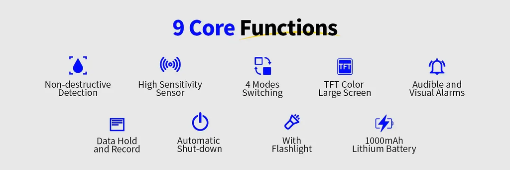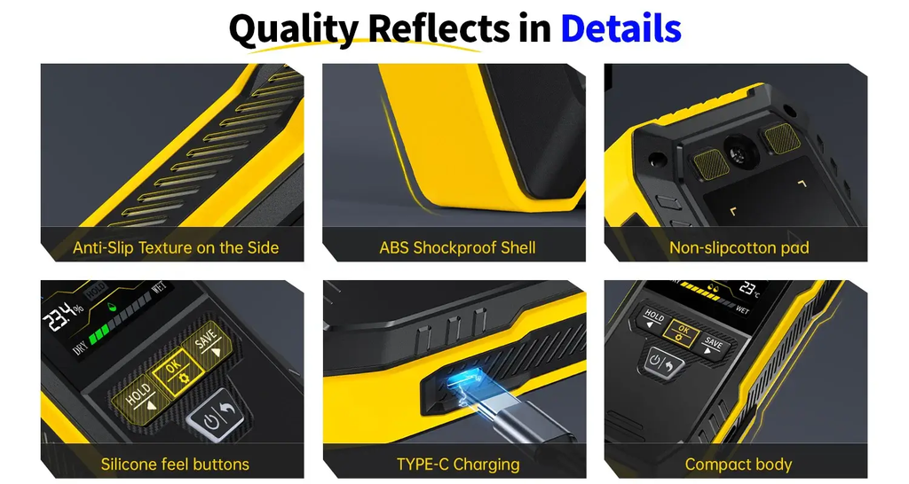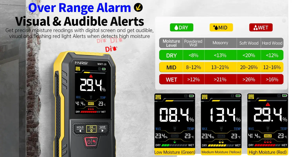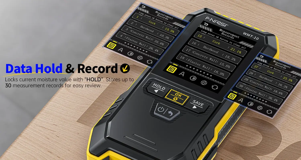 Máy đo độ ẩm gỗ FNIRSI® WMT-10 Non-Contact Inductive Wood & Wall Moisture Meter được trang bị màn hình màu độ nét cao 2.4 inch, được thiết kế đặc biệt để đáp ứng nhu cầu của ngành chế biến gỗ và người dùng gỗ. Thiết bị tiên tiến này đảm bảo đo chính xác độ ẩm trong gỗ, hỗ trợ 4 chế độ đo khác nhau: gỗ cứng, gỗ mềm, tường thạch cao và tường gạch.