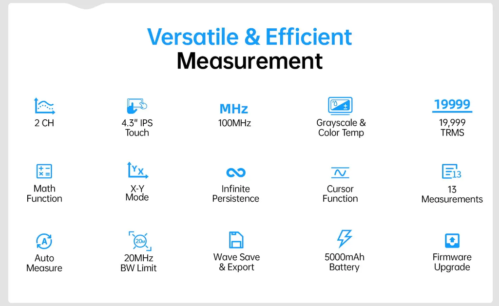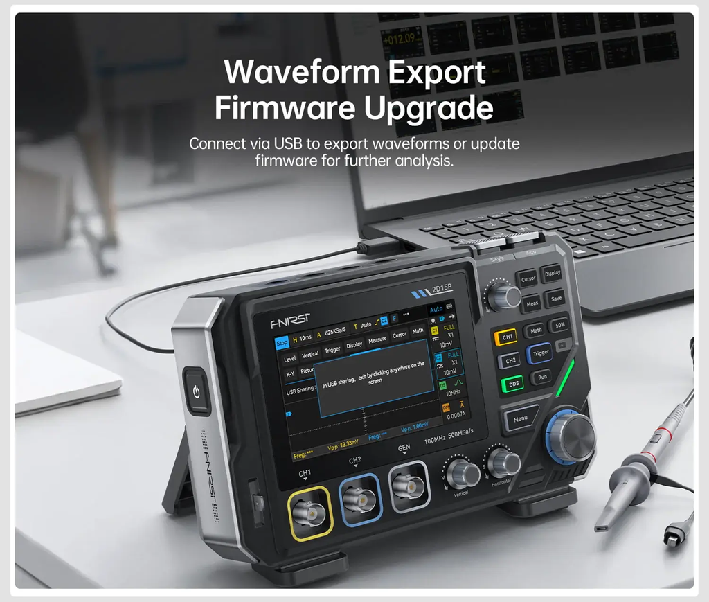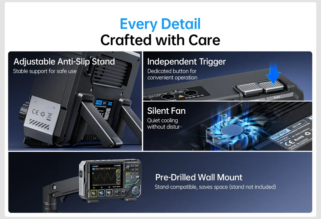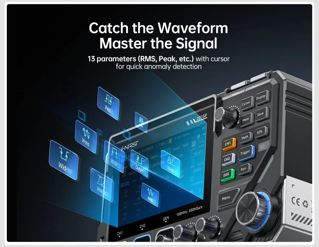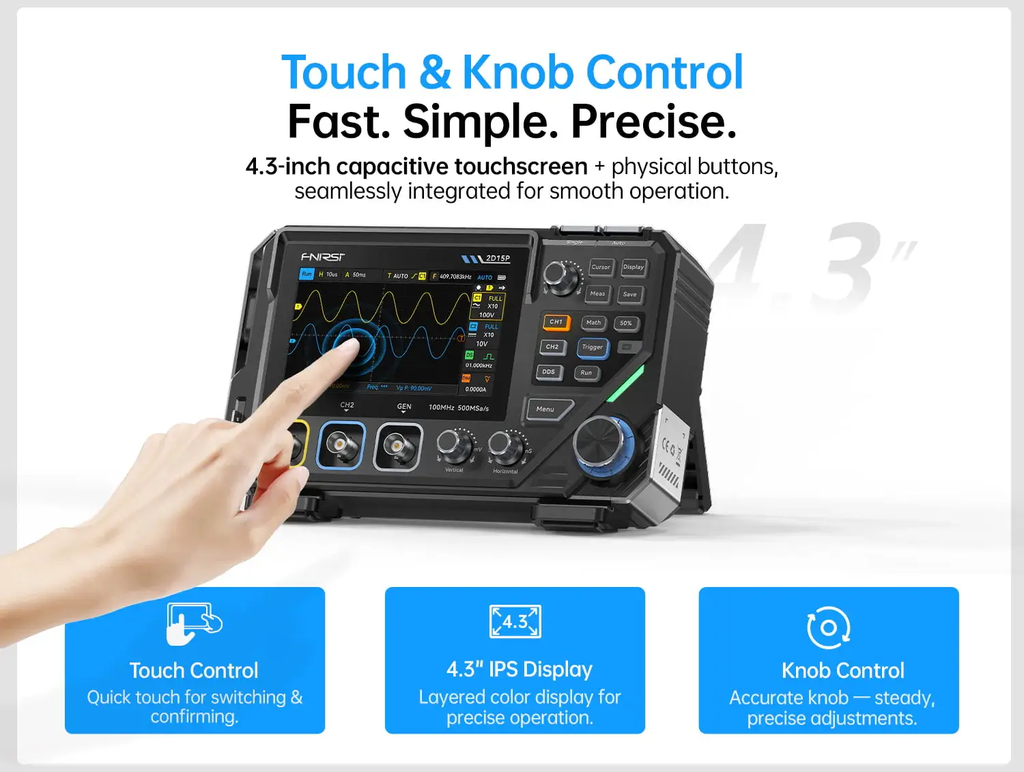 Máy đo hiện sóng FNIRSI® 2D15P 3-in-1 Benchtop 2CH 100MHz Phosphor Oscilloscope Multimeter sử dụng màn hình cảm ứng IPS 4.3 inch kết hợp phím vật lý, mang lại trải nghiệm điều khiển linh hoạt và trực quan. Với băng thông lên đến 100MHz, tốc độ lấy mẫu 500MSa/s cùng bộ nhớ sâu tối đa 1M, FNIRSI 2D15P đáp ứng tốt các nhu cầu đo lường, phân tích tín hiệu trong sửa chữa điện tử, học tập và nghiên cứu. Ngoài ra, máy còn tích hợp đồng hồ True RMS 19999 counts và bộ phát sóng DDS 10MHz, giúp người dùng dễ dàng kiểm tra và mô phỏng tín hiệu trong nhiều ứng dụng khác nhau.