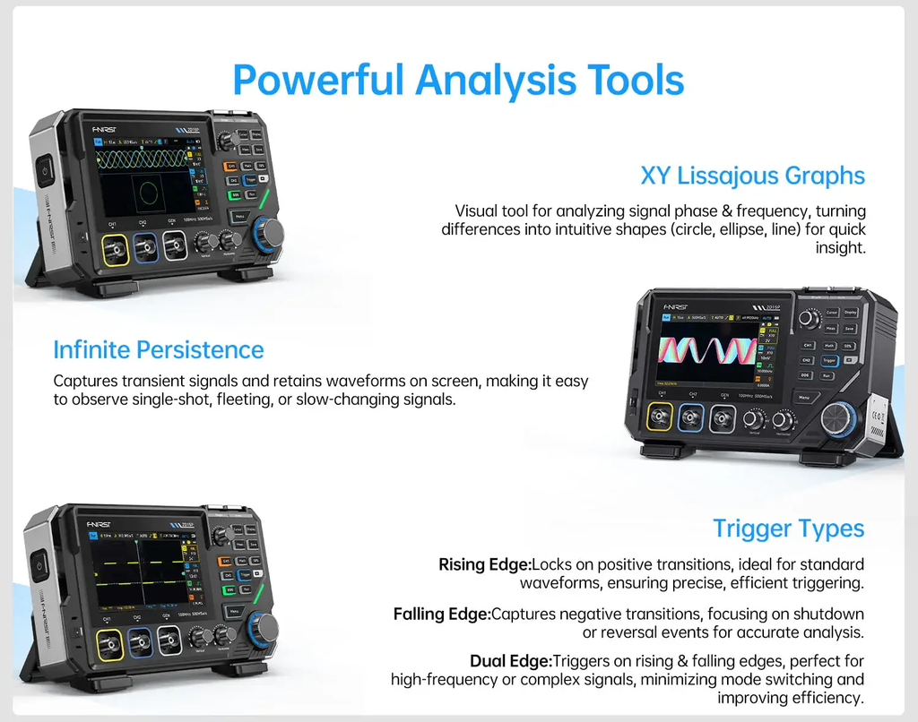 Máy đo hiện sóng FNIRSI® 2D15P 3-in-1 Benchtop 2CH 100MHz Phosphor Oscilloscope Multimeter là thiết bị đo lường đa năng 3 trong 1 kết hợp giữa máy hiện sóng (oscilloscope), đồng hồ vạn năng (multimeter) và máy phát tín hiệu (signal generator) trong một thiết kế nhỏ gọn.