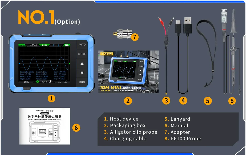 Máy đo hiện sóng FNIRSI® DSO-510 Mini Handheld Digital Oscilloscope + Signal Generator là một thiết bị đo lường tích hợp hai chức năng trong một: máy hiện sóng kỹ thuật số (Digital Oscilloscope) và máy phát tín hiệu (Signal Generator) kèm theo màn hình LCD 2.8″ HD (320 × 240) cho hình ảnh rõ nét.