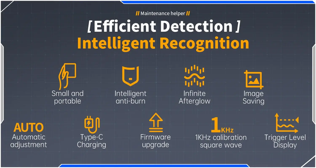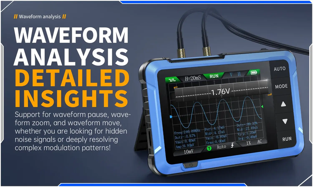 Máy đo hiện sóng FNIRSI® DSO-510 Mini Handheld Digital Oscilloscope + Signal Generator có tốc độ lấy mẫu cao 48 MS/s và băng thông 10 MHz giúp theo dõi tín hiệu nhanh và chính xác với dải đo điện áp lên đến ±400V. Thiết bị còn sở hữu chức năng AUTO một chạm giúp tối ưu nhanh các thông số đo. Đồng thời, với bộ phát tín hiệu DDS hỗ trợ đến 13 dạng sóng và tần số tối đa 50kHz, DSO-510 cung cấp khả năng đo đạc cơ bản nhưng hiệu quả, máy được thiết kế nhỏ gọn và tiện lợi cho các kỹ sư điện tử, sinh viên và những người đam mê DIY.