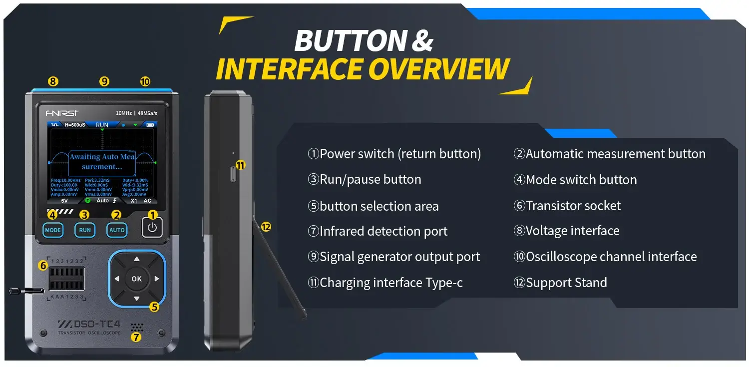 Máy đo hiện sóng FNIRSI® DSO-TC4 3-IN-1 Digital Oscilloscope + Transistor Tester + Signal Generator là thiết bị đo lường 3-trong-1 nhỏ gọn, tích hợp máy hiện sóng Digital Oscilloscope băng thông 10 MHz, máy phát tín hiệu Signal Generator 13 dạng sóng (0–50 kHz) và bộ kiểm tra linh kiện Transistor Tester tự động nhận diện Transistor, Diode, MOSFET,… Với màn hình màu 2.8″, pin sạc 1500 mAh và cổng USB-C tiện dụng, DSO-TC4 là giải pháp lý tưởng cho sửa chữa điện tử, nghiên cứu và DIY.