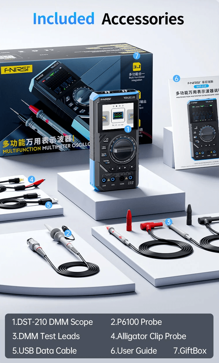 Máy đo hiện sóng FNIRSI® DST-210 Handheld 3-IN-1 Multimeter Oscilloscope Signal Generator là thiết bị đo kiểm đa năng “all-in-one” được phát triển dành cho sửa chữa điện tử, nghiên cứu R&D, giảng dạy và DIY. Sản phẩm tích hợp đồng hồ vạn năng True RMS, máy hiện sóng (oscilloscope) và máy phát tín hiệu trong cùng một thiết bị nhỏ gọn, giúp người dùng tiết kiệm chi phí và không cần sử dụng nhiều thiết bị riêng lẻ.
