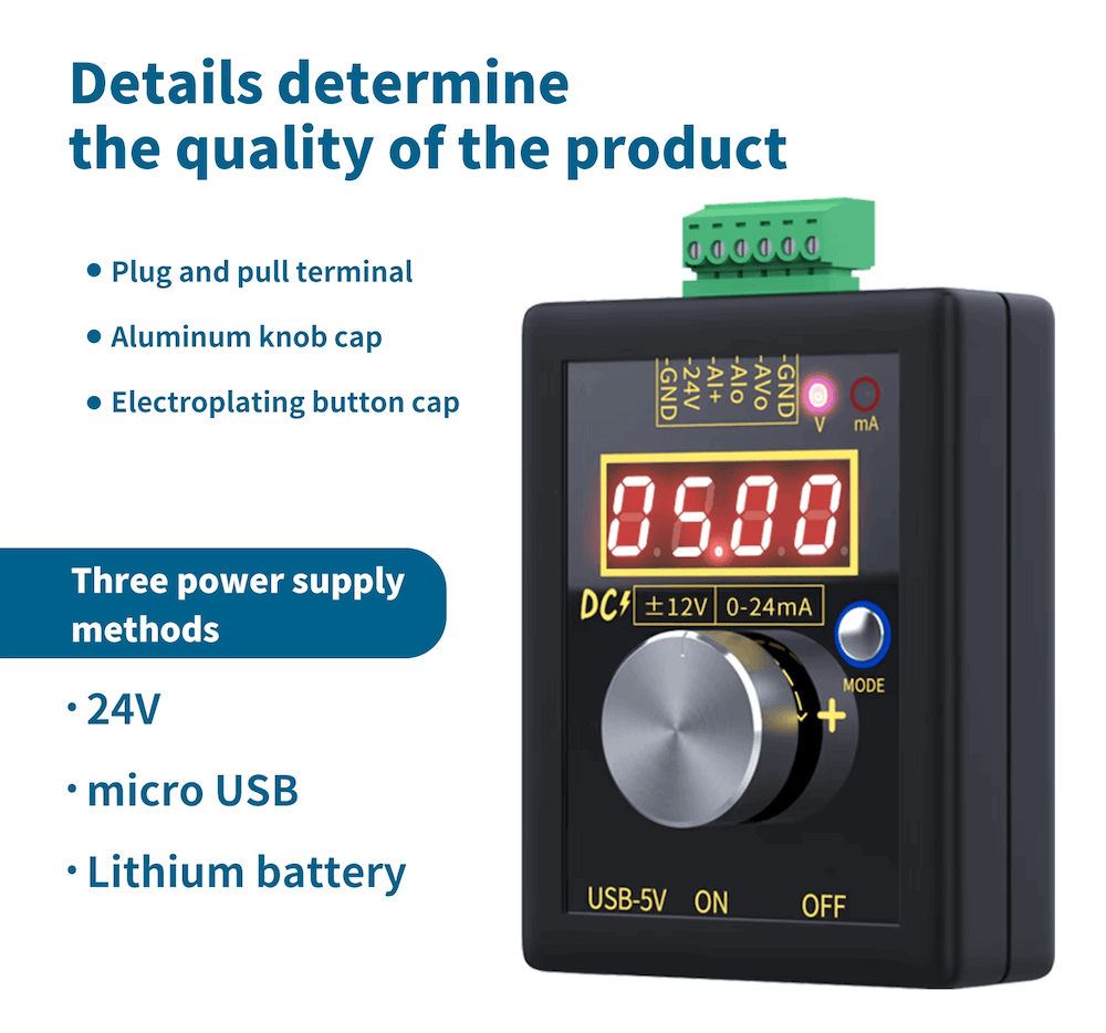 Máy tạo tín hiệu FNIRSI® SG-002 Signal Generator with battery được sử dụng để tạo tín hiệu điện áp và dòng điện ±12V/0-24mA trong các ứng dụng hiệu chuẩn hoặc kiểm tra các hệ thống điện và điện tử, thiết bị được thiết kế cầm tay nhỏ gọn tích hợp pin sạc tiện lợi để dễ dàng mang theo khi làm việc ngoài hiện trường.