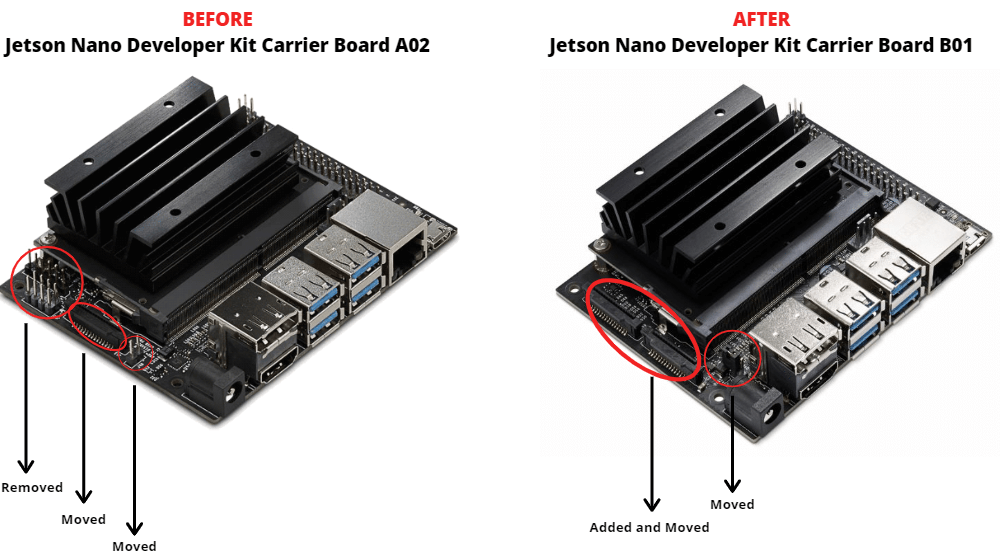 Máy tính AI NVIDIA Jetson Nano Developer Kit B01 là phiên bản nâng cấp của phiên bản cũ A02 với mặt đế board chức năng (Carrier Board) được bổ sung 2 khe cắm Camera CSI và một số thay đổi như hình, tuy nhiên bo mạch xử lý trung tâm và các chân GPIO gần như không thay đổi so với phiên bản A02: