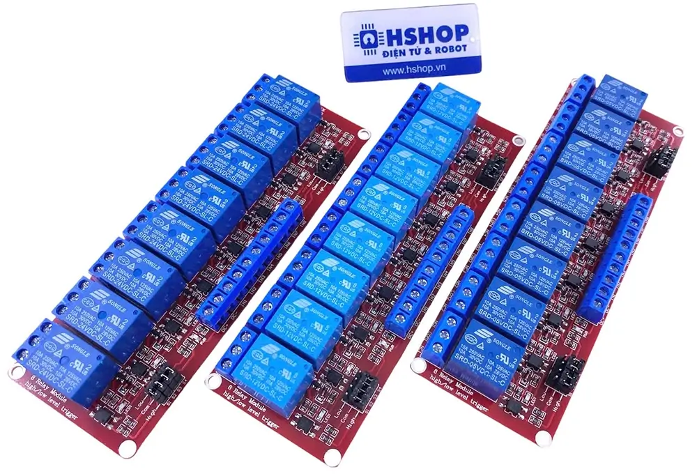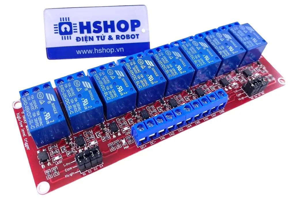 Mạch 8 Relay Opto chọn mức kích High/Low (5/12/24VDC) được sử dụng để bật, tắt thiết bị AC/DC qua Relay, mạch có thể tùy chọn kích bằng mức cao hoặc thấp (High/Low) qua Jumper, ngoài ra mạch còn bổ sung thêm Opto cách ly cho độ an toàn và chống nhiễu vượt trội (một số mạch trên thị trường không có Opto), thích hợp với các ứng dụng bật tắt, điều khiển thiết bị qua Relay.