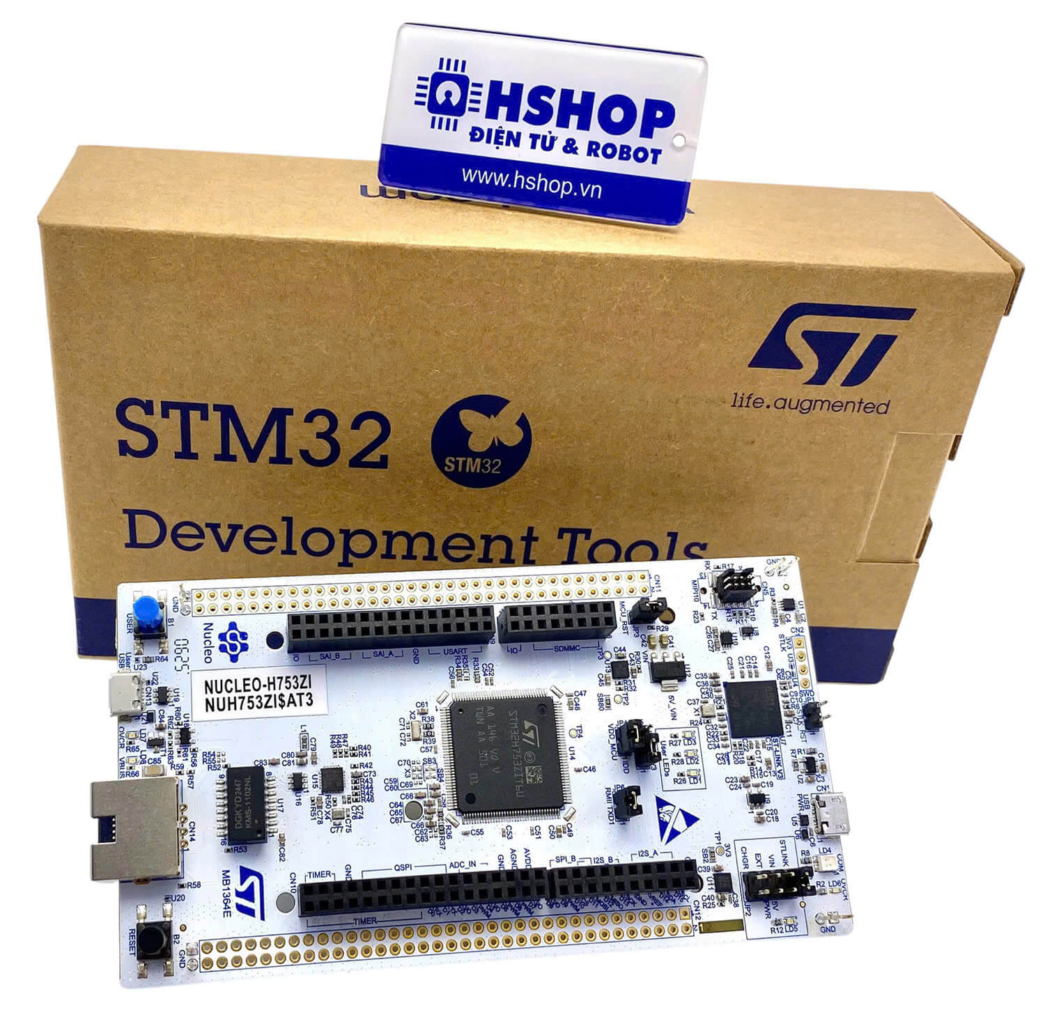 Kit NUCLEO-H753ZI được trang bị ST Zio connector cùng với các header ST morpho, giúp dễ dàng mở rộng chức năng với nhiều shield và module chuyên dụng. Kit còn tích hợp sẵn ST-LINK debugger/programmer, không cần mạch nạp rời, đồng thời đi kèm hệ sinh thái phần mềm miễn phí đầy đủ gồm thư viện và ví dụ trong STM32Cube MCU Package, hỗ trợ tối ưu cho học tập, nghiên cứu và phát triển ứng dụng nhúng chuyên nghiệp.