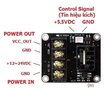 Lưu ý: Nếu tải là động cơ (tải cảm) cần gắn thêm 1 Diod ngay ngõ ra (Annot - GND, Catot - VCC_OUT) để bảo vệ FET khỏi dòng xả ngược từ động cơ tránh gây cháy FET.