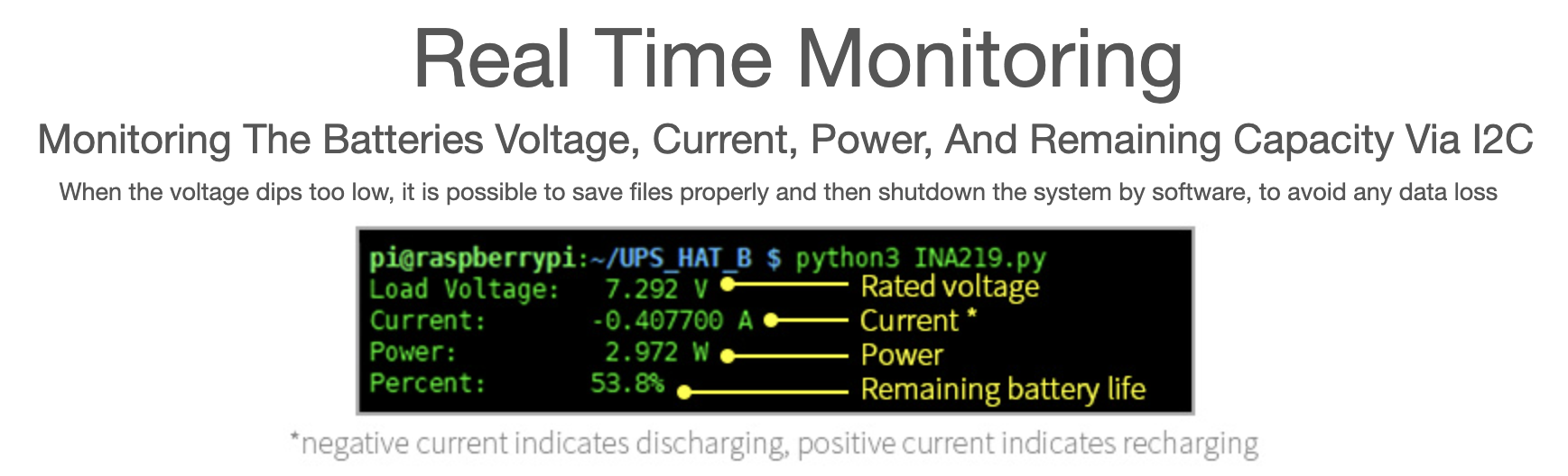 • I2C bus communication, monitoring the batteries voltage, current, power, and remaining capacity in real-time.