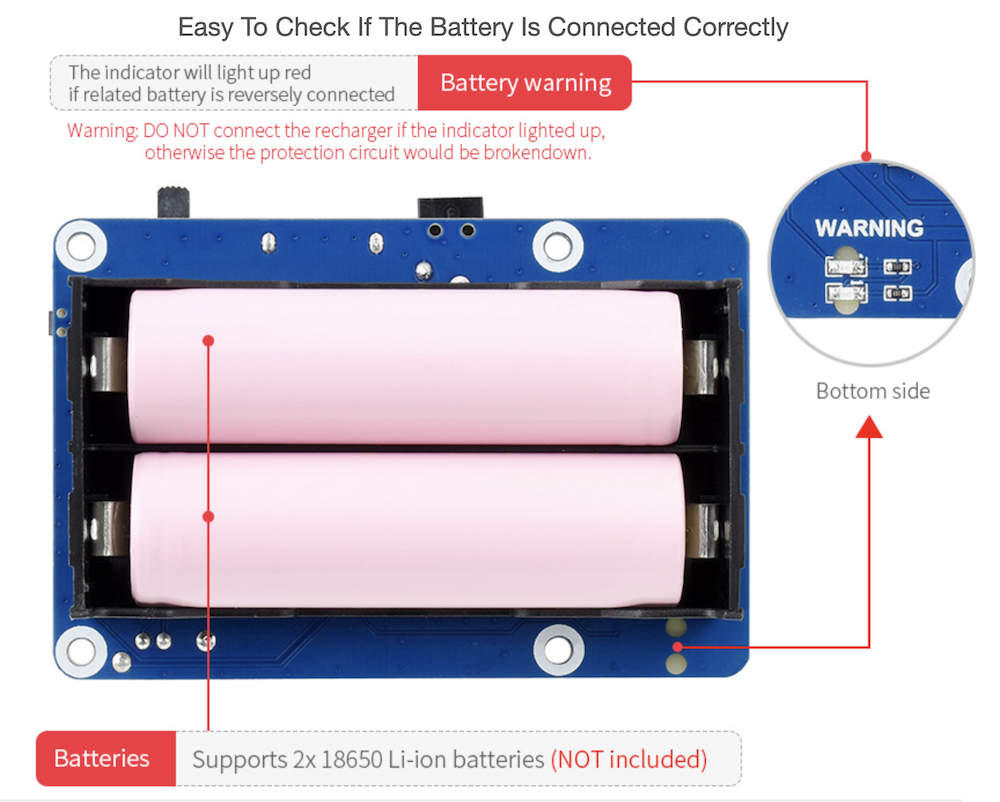 • Batteries warning indicators, easy to check if the battery is connected correctly.