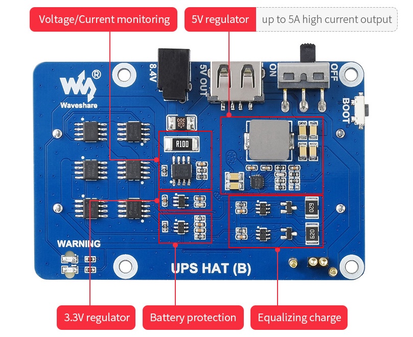 Mạch Waveshare UPS HAT (B) for Raspberry Pi, 5V 5A , Pogo Pins Connector là phiên bản nâng cấp mới nhất với dòng điện cung cấp lên đến 5A phù hợp với Raspberry Pi 5, mạch còn có thiết kế cải tiến kết nối qua Pogo Pins ở mặt dưới của Raspberry Pi nên sẽ không ảnh hưởng khi lắp đặt tản nhiệt hoặc các mạch HAT ở phía trên.