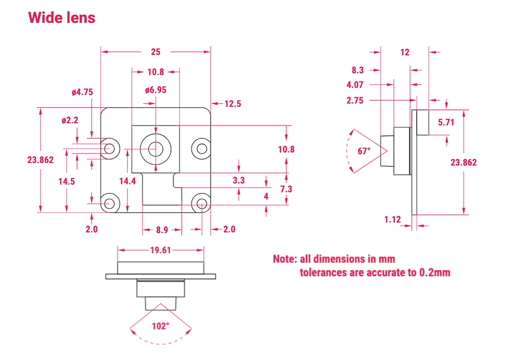 Raspberry Pi Camera Module 3 có hai phiên bản: góc tiêu chuẩn (Standard) 75° và góc rộng (Wide) 120°, mỗi loại đều có phiên bản có hoặc không có bộ lọc hồng ngoại (NoIR).