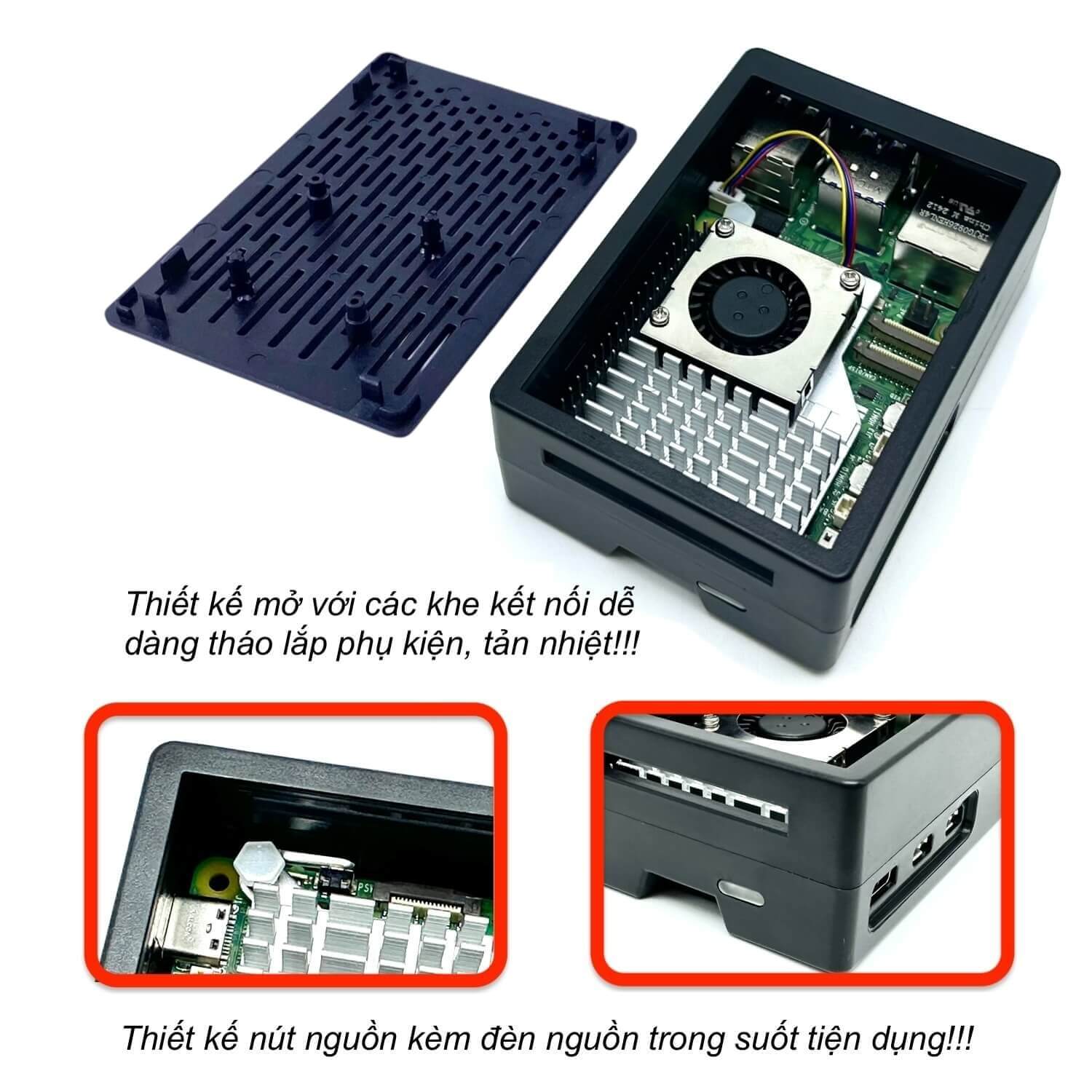 Vỏ bảo vệ bằng nhựa ABS Case for Raspberry Pi 5 V2 có thiết kế vô cùng linh hoạt, dễ tháo lắp với 3 phần đế, thân và nắp riêng biệt gắn với nhau bằng các khớp nối vô cùng chắc chắn, bổ sung các khe thoáng khí và khe kết nối phụ kiện dễ dàng.