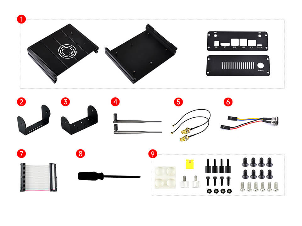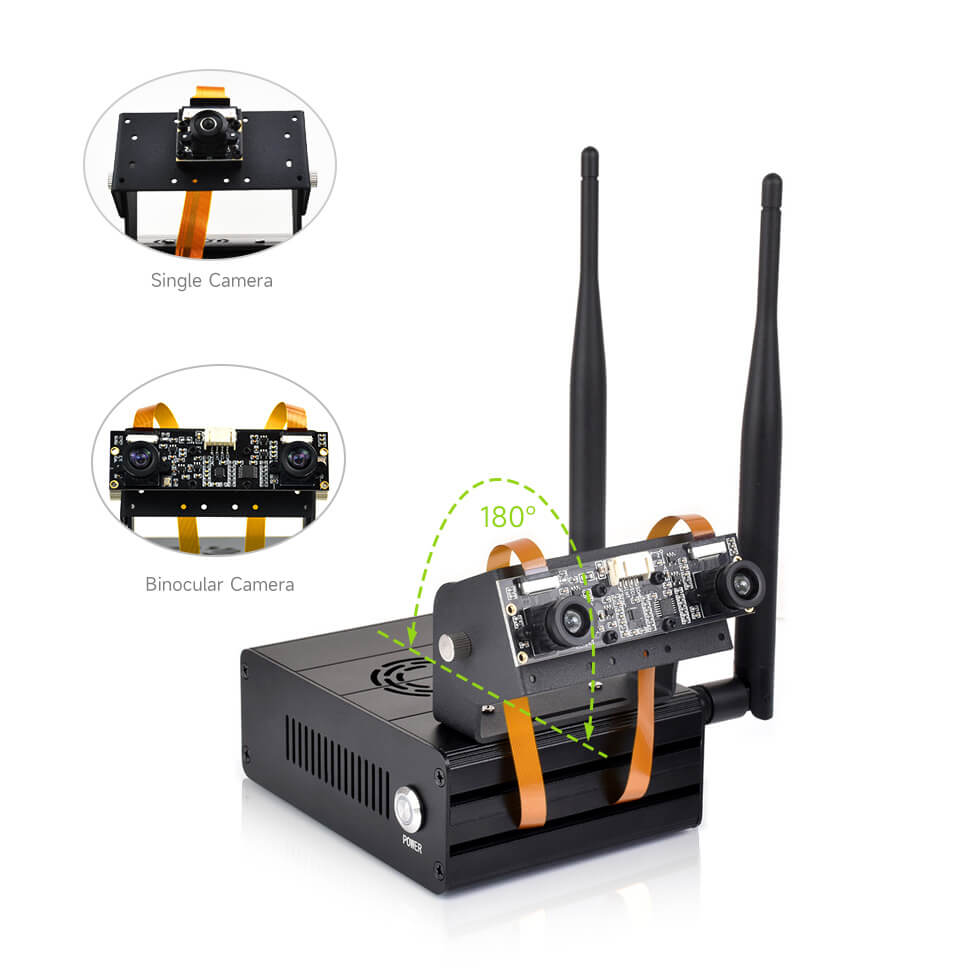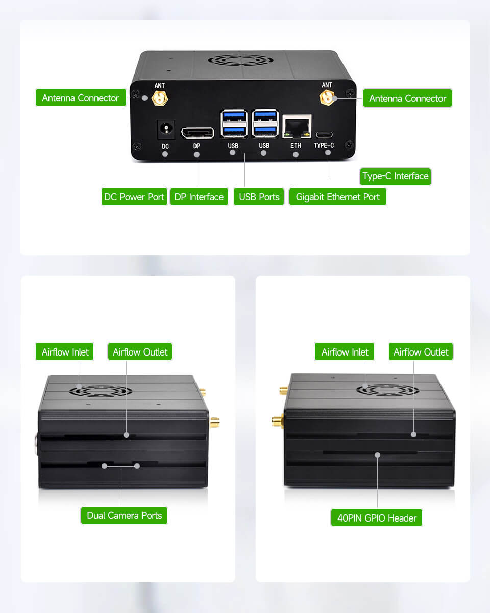 Vỏ case Waveshare Jetson Orin Aluminum Alloy Case, With Camera Holder tích hợp các thiết kế giúp bạn có thể thao tác và sử dụng Jetson Orin Nano Super và các phụ kiện một cách dễ dàng: Gá giữ Camera, nút nhấn nguồn, Anten và cáp nối đi kèm, các cổng kết nối,...